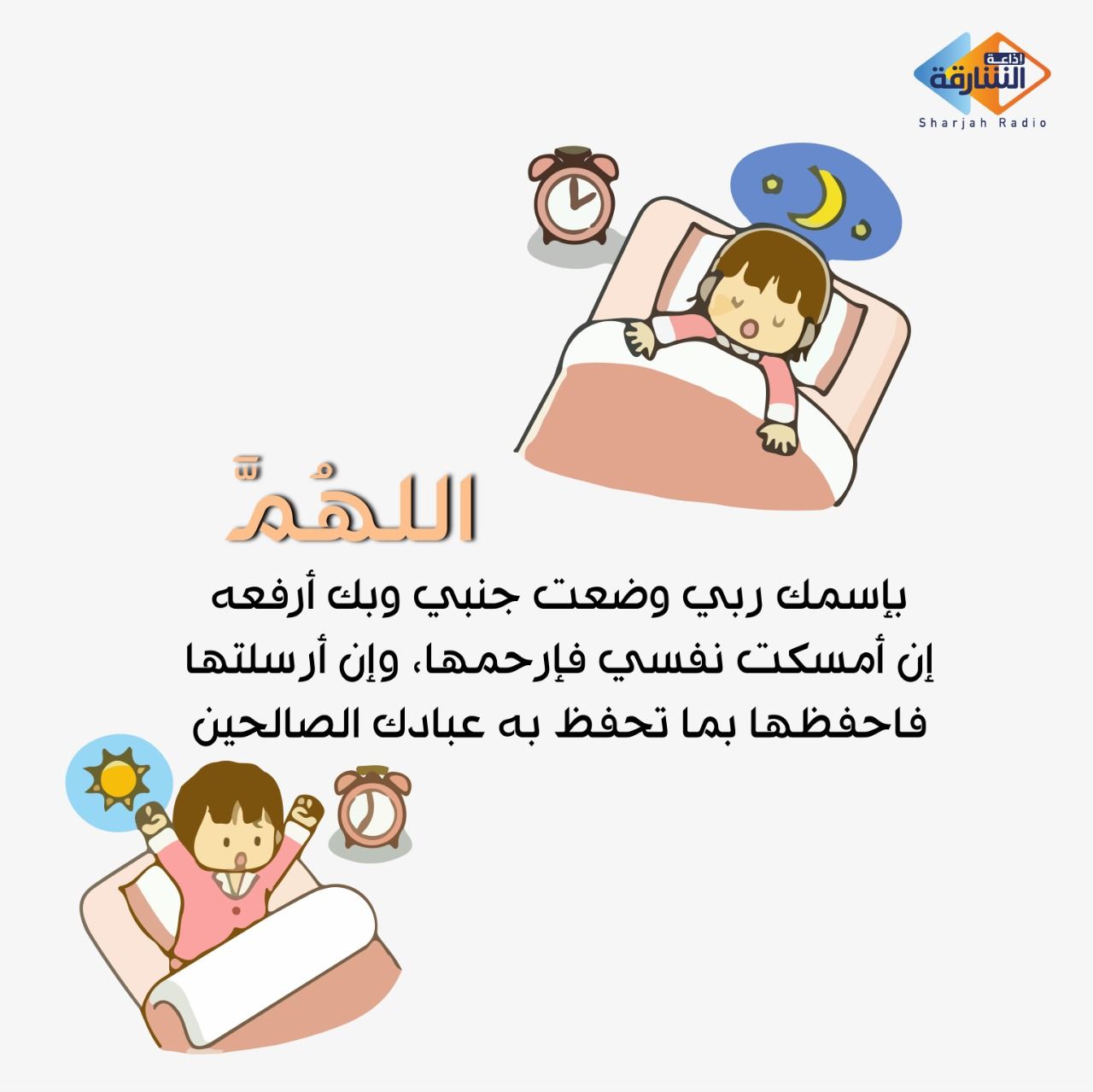 اللهم أجرنا من موت الغفلة ولا تأخذنا من هذه الدنيا إلا وأنت راض عنا. 16 بسم الله وضعت جنبي اللهم اغفر لي ذنبي وأخسئ شيطاني وفك رهاني واجعلني في الندي الأعلى أي في الملأ الأعلى من الملائكة. باسمك ربي وضعت جنبي وبك أرفعه إن أمسكت نفسي فارحمها وإن أرسلتها فاحفظها بما تحفظ به عبادك الصالحين تصبحون على خير. 7 باسمك اللهم أموت وأحيا.