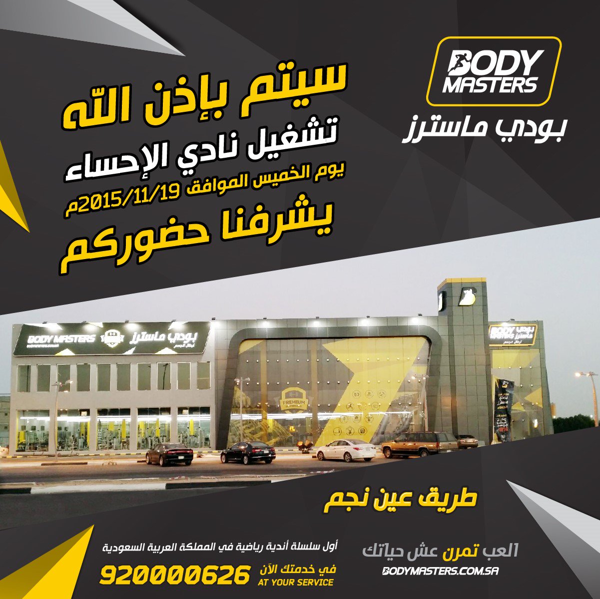 بودي ماسترز الاحساء. أعلنت شركة الأندية للرياضة بودي ماسترز أول سلسلة أندية رياضية بالمملكة عن بدء مبيعات ما قبل الافتتاح في فرعها الثاني في محافظة الأحساء في مدينة الهفوف والواقع على طريق الرياض في مجمع ذي فاليه. Go to form التعليمات الوظائف اتصل بنا انضم الان تطبيق شركاء النجاح الوظائف اتصل بنا انضم الان تطبيق شركاء النجاح. متر مربع لتشمل مناطق الرياض جدة الدمام مكة المكرمة القصيم الاحساء. عروض بودى ماستر السعودية فقط انتهز الفرصة واحصل على خصم 60 فى جميع بودى ماستر السعودية باقى فقط 3 ايام على انتهاء الخصم.